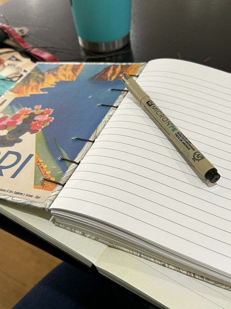 The binding of a book, just as you want it. Bound with one of the most ancient stitches. Lined Paper? Blank Paper? Graph Paper? Watercolor paper? What kind of design would you choose for the front and inside covers of this secret keeper? This collection of your ideas, and dreams, and thoughts, and doodles…