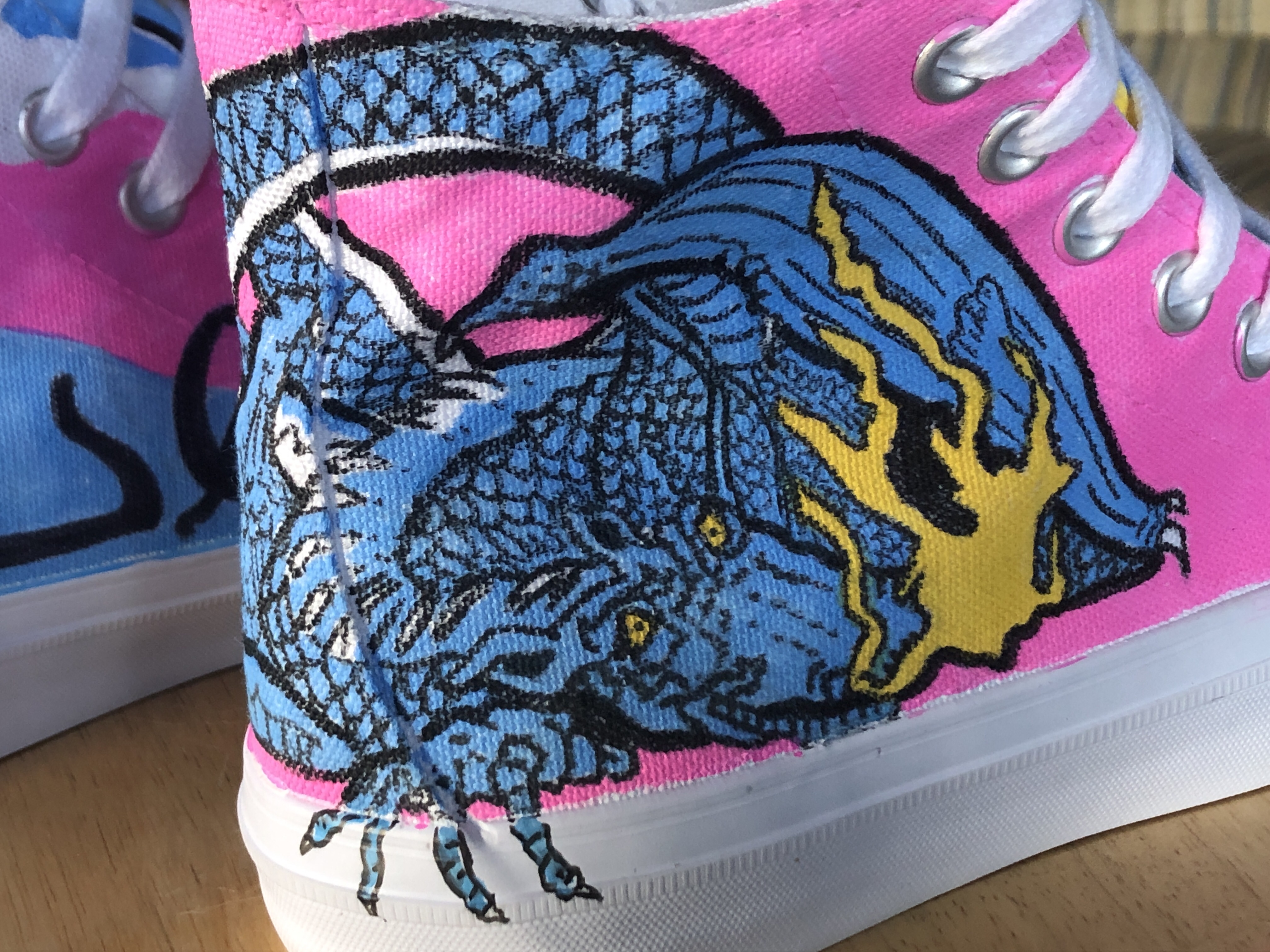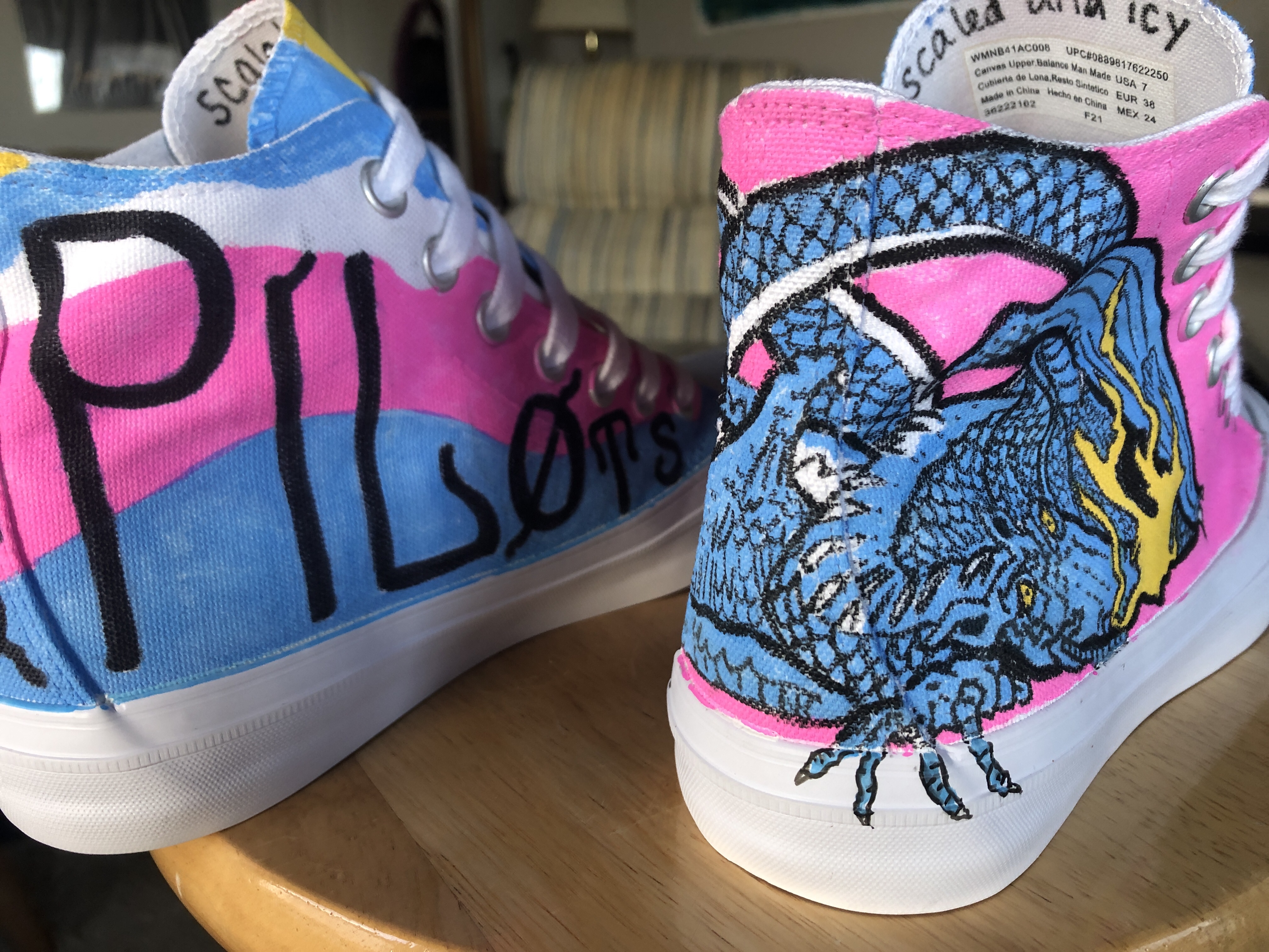 A friend asked me to make shoes for her and her daughter when they go to the Twenty One Pilots concert at the end of the month. Their newest album is “Scaled and Icy” and features a pretty sweet dragon on the front.