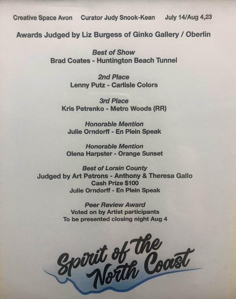July- August 2023 I had a few pieces in a gallery themed “Spirit of the North Coast” whose prerequisite was you had to live in a county that boarders Lake Erie. (Whoop Whoop Lorain County!) The judges included the lady who runs the Ginko Gallery in Oberlin as well as the Lorain County Commissioner and his wife.