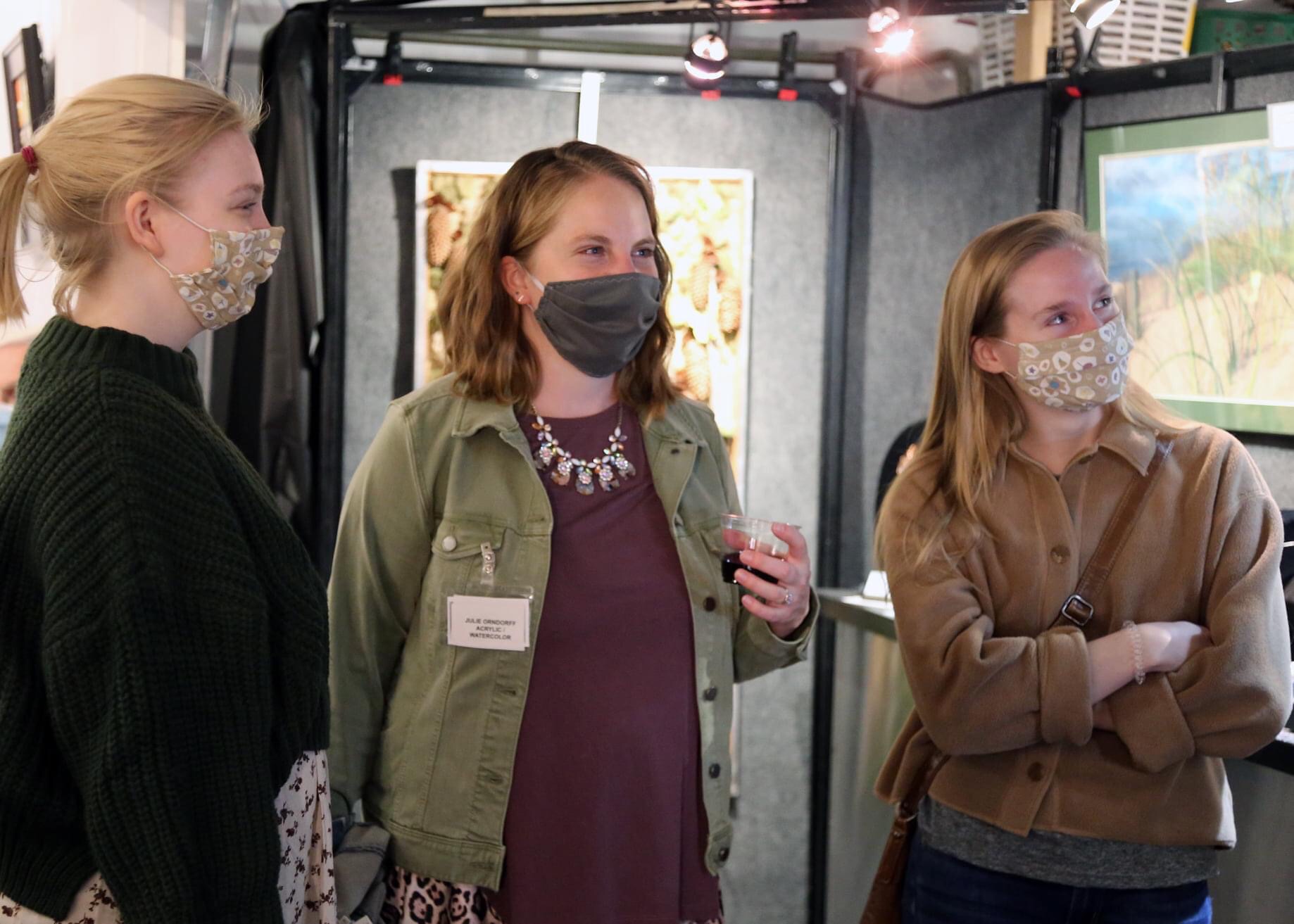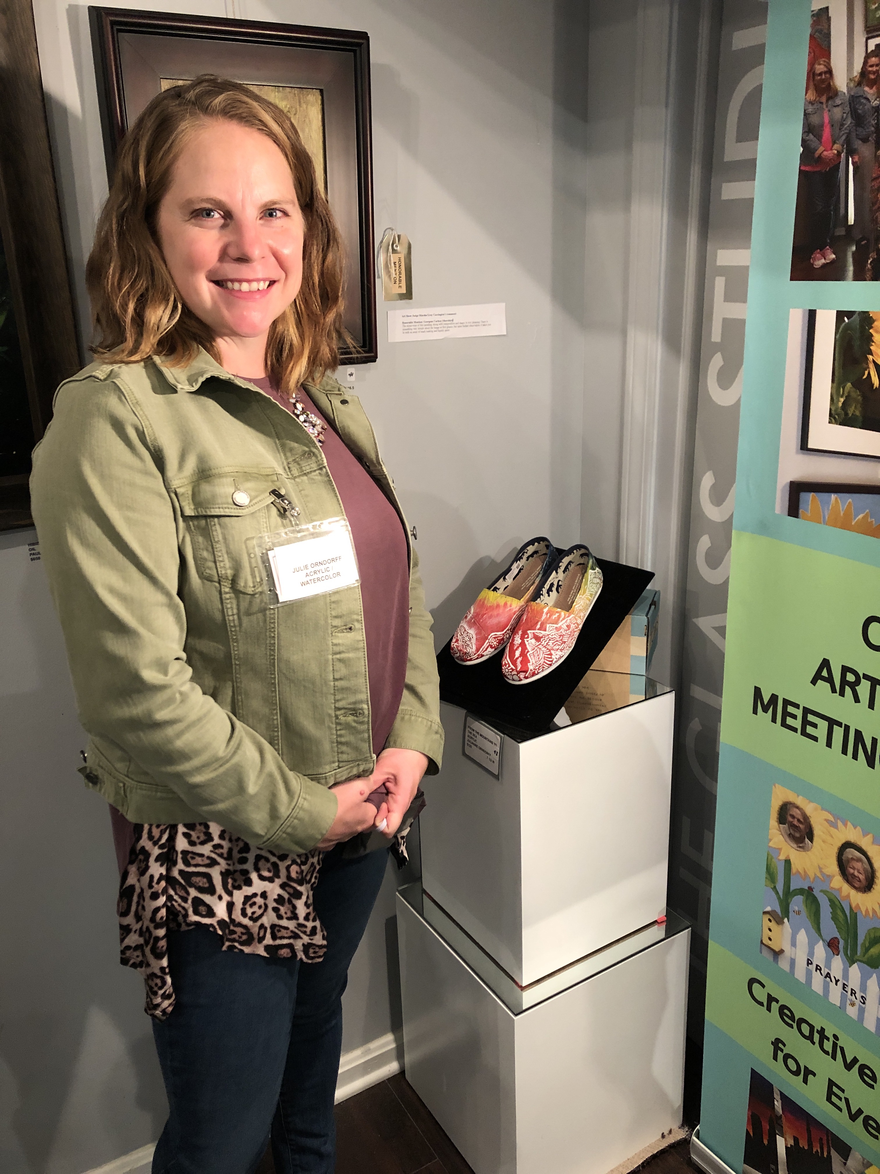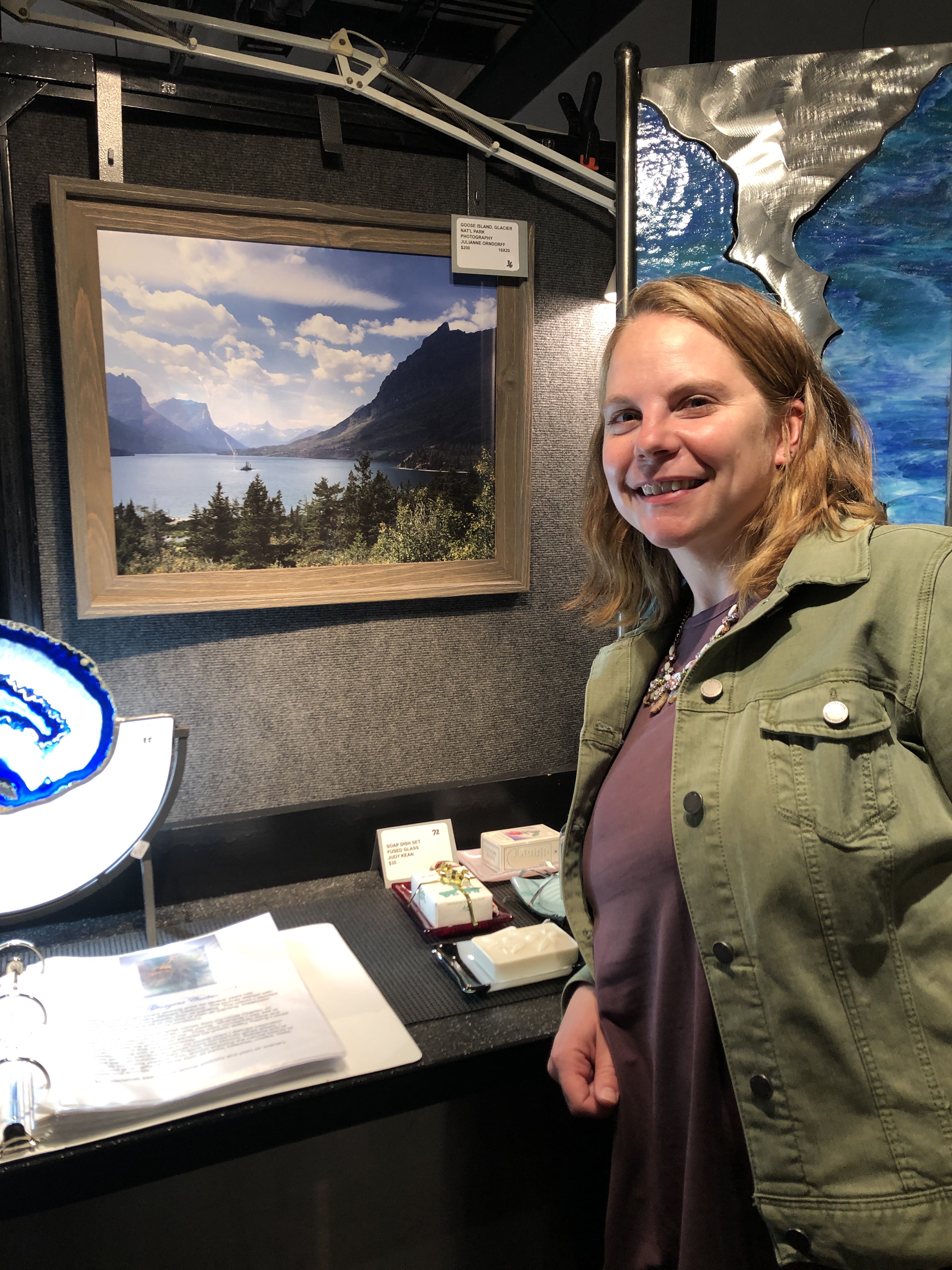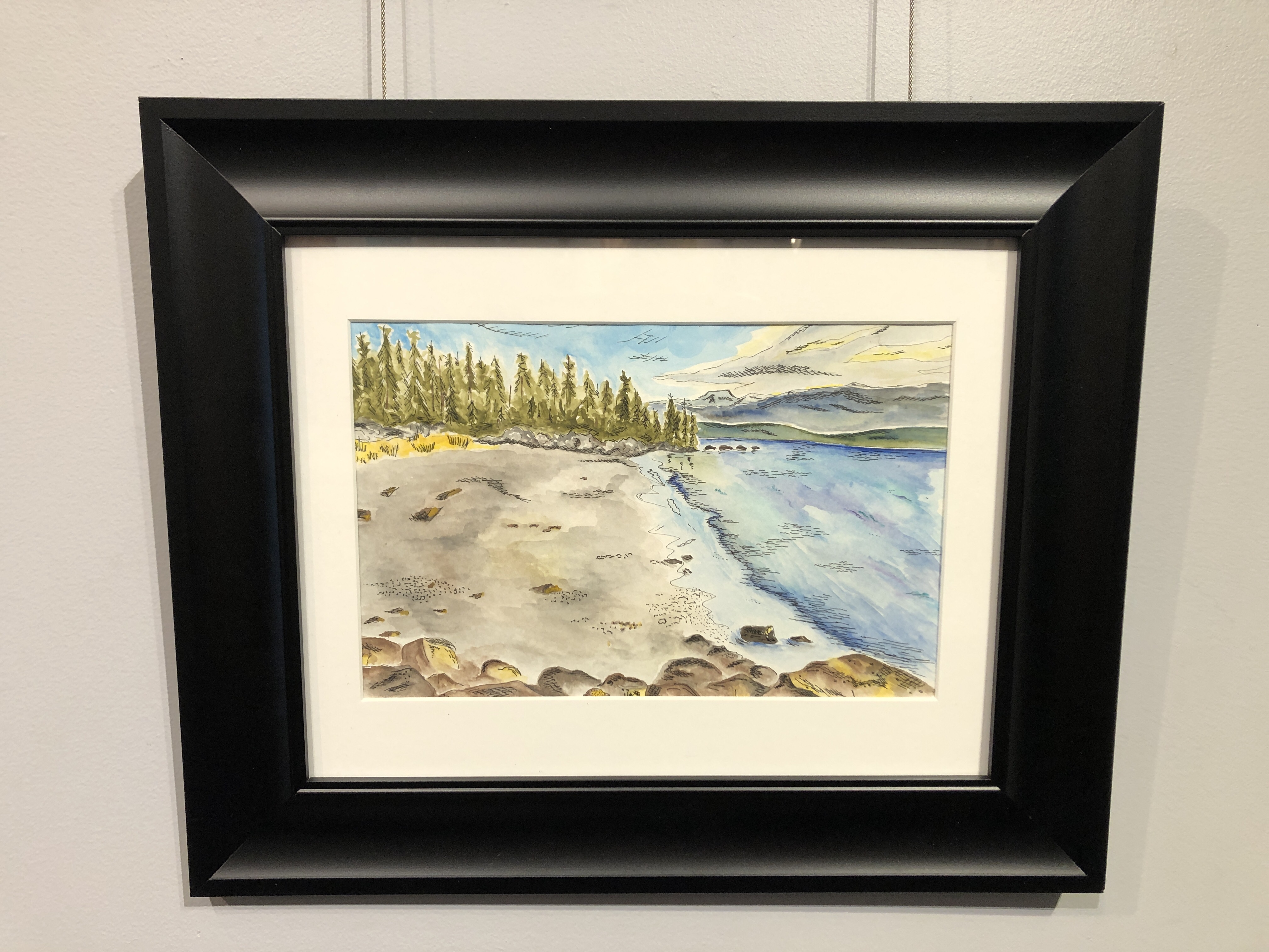 Pieces included “Kayak Beach at Tutka Bay” watercolor and ink, “From the mountains to the sea” acrylic painted Tom’s shoes, and “Goose Island at Glacier NP” photograph.