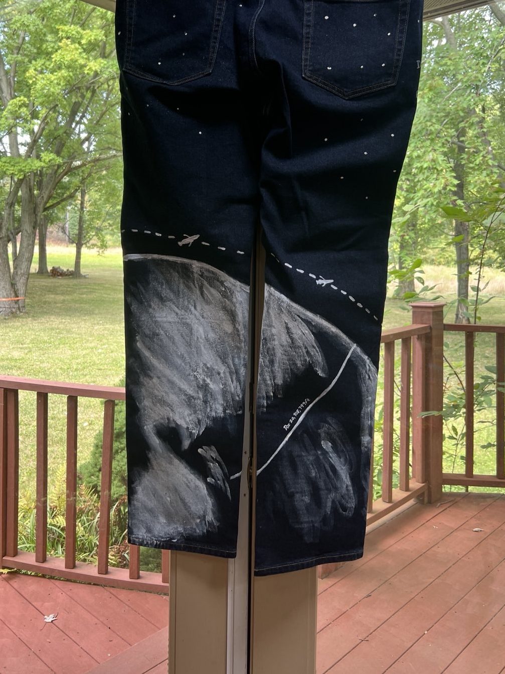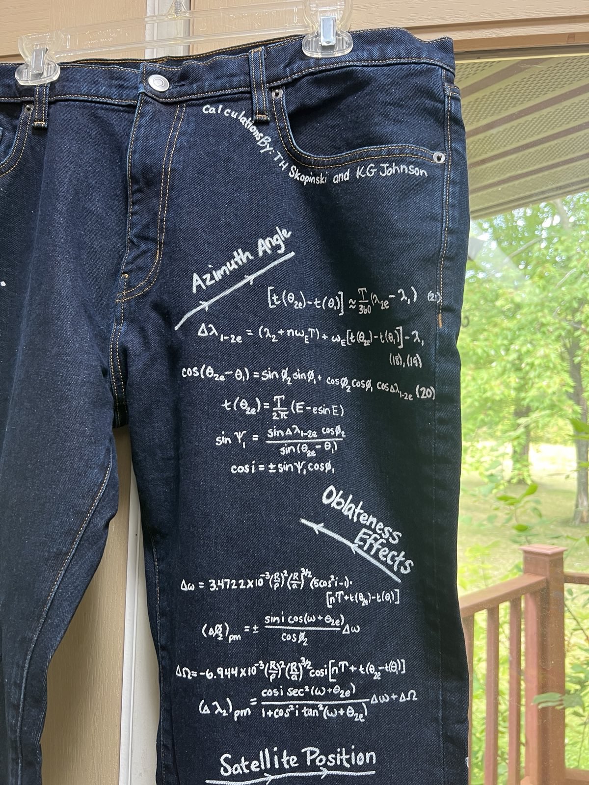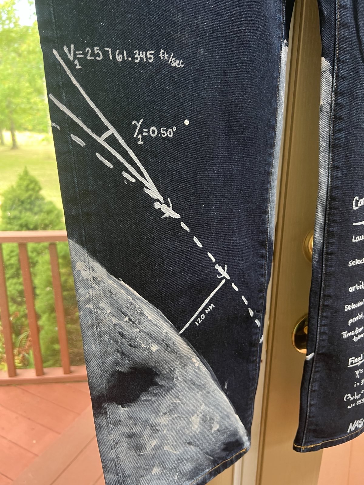 The paper I used to paint these pants was not the “Go – No – Go” Paper from the movie (which I believe is this one), but it is one that focuses on placing a satellite in a certain position above the Earth’s surface – this is similar, but not the resulting paper from the work portrayed in the movie. It details the calculations for both an Eastward and Westward launch of a Earth-made satellite after having made 3 orbits around the Earth in the Orbital Plane – which I believe to be 120 Nautical Miles. Reading through Ms. Johnson’s Technical Note, it was a little bit of a challenge to figure out what equations to include on the pants. There was a part in the other paper where she stated that she used Partial Fraction Decomposition (shout out to all my Advanced Pre-Calc kids who thought it would never be used outside of the class room!) and some trig substitutions in the Pant’s paper. However, much of the calculations seemed to be applied trigonometry, which was cool to see.